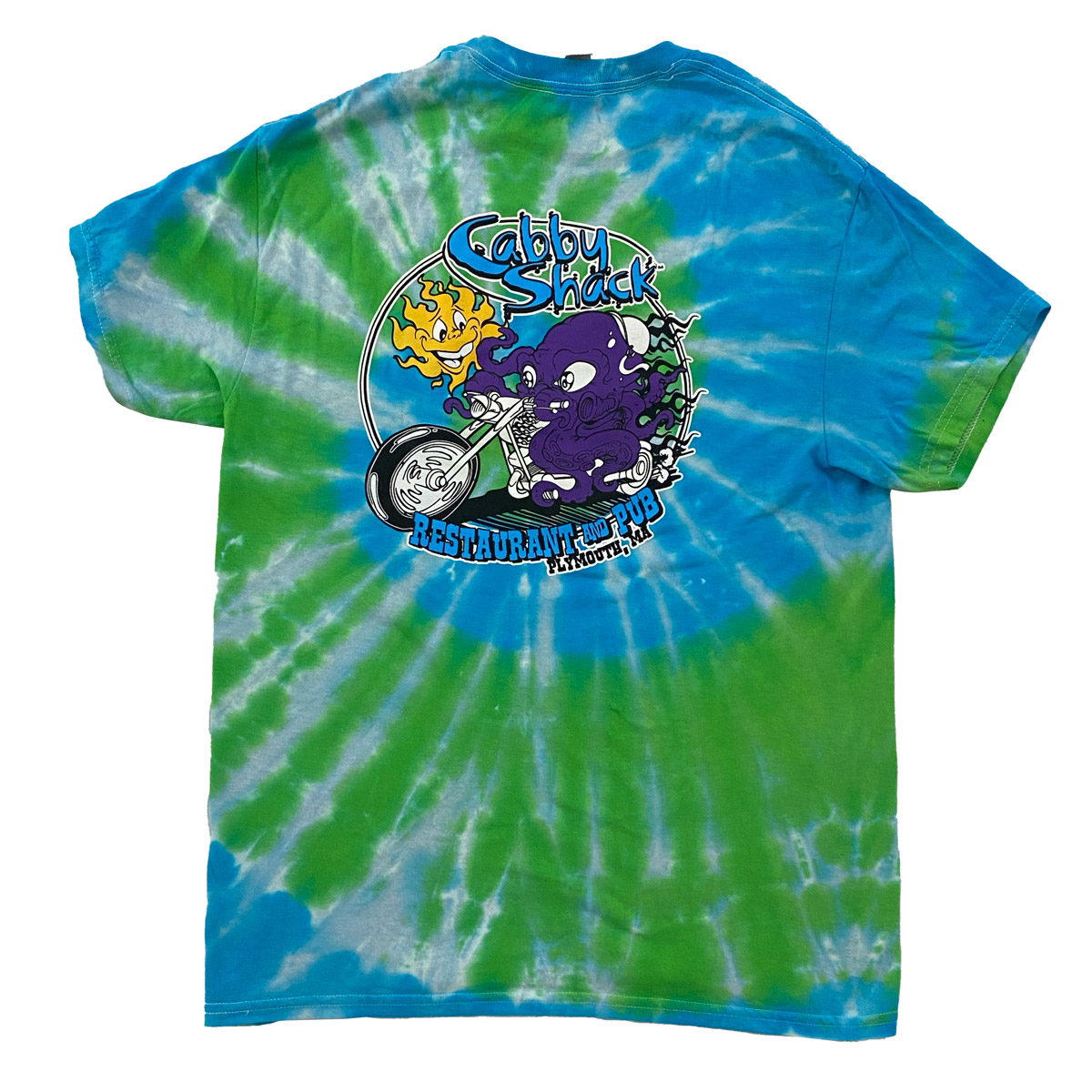 This green and blue men's crew-neck tee features the CabbyShack logo on the left chest and a motorcycle-riding octopus on the back.