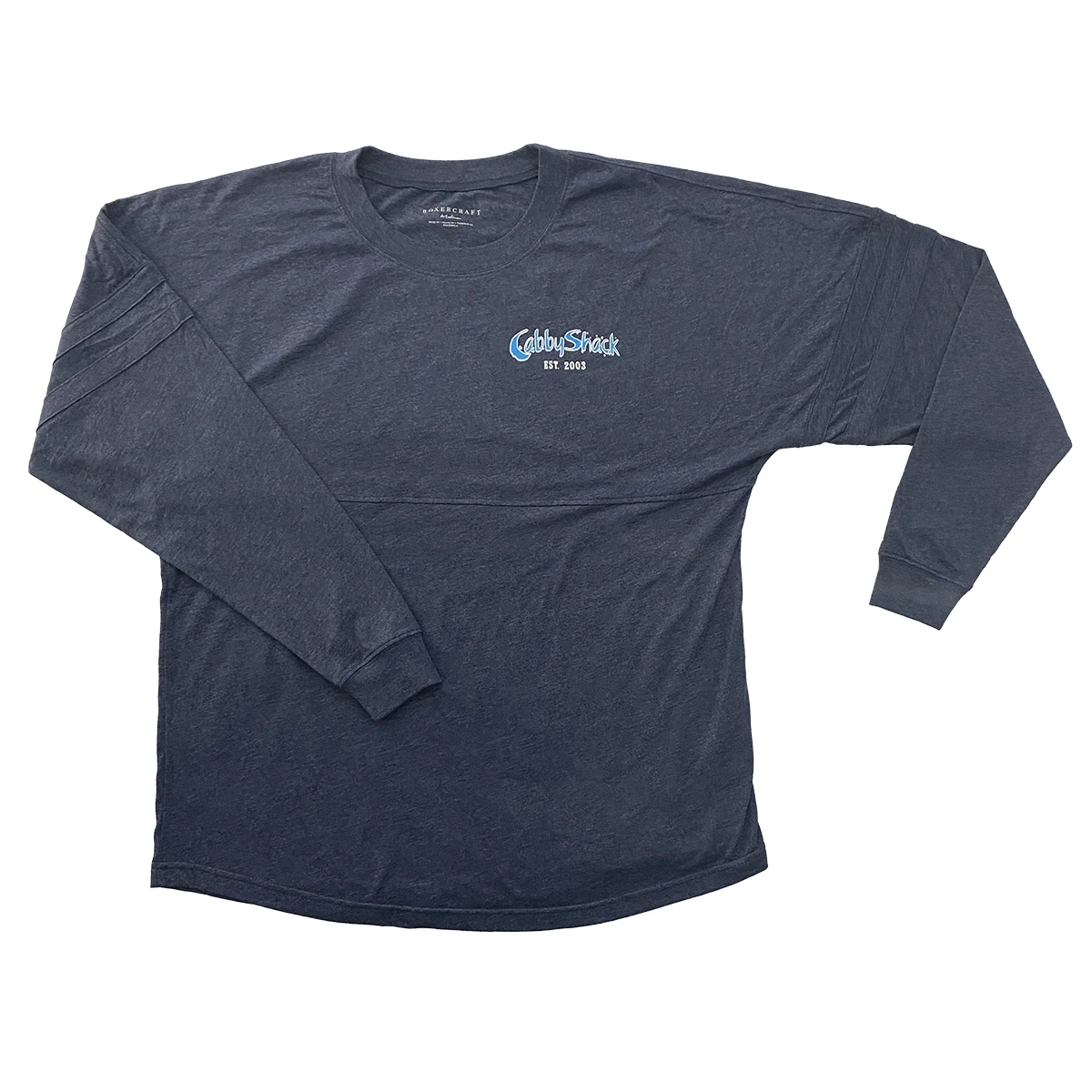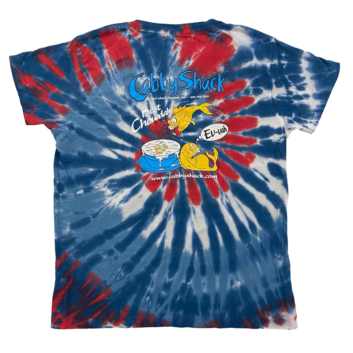 Available in Red/Blue, Purple/Red, or Rainbow, this V-Neck tee has the CabbyShack logo on the chest and "Best Chowdah Ev-vah" on the back.