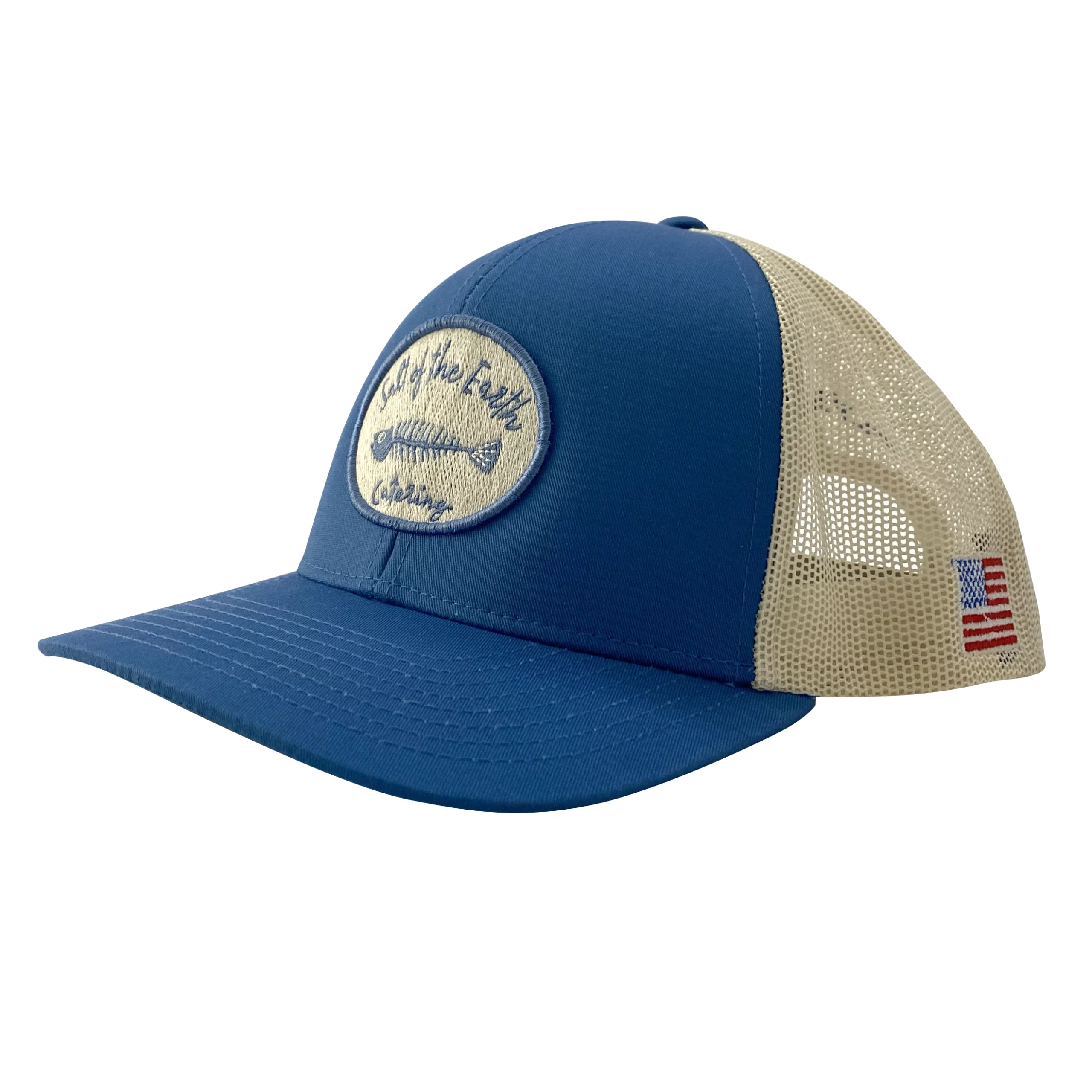 This snap-back trucker features the Salt of the Earth logo on the front, Plymouth on the rear, and an American flag patch.
